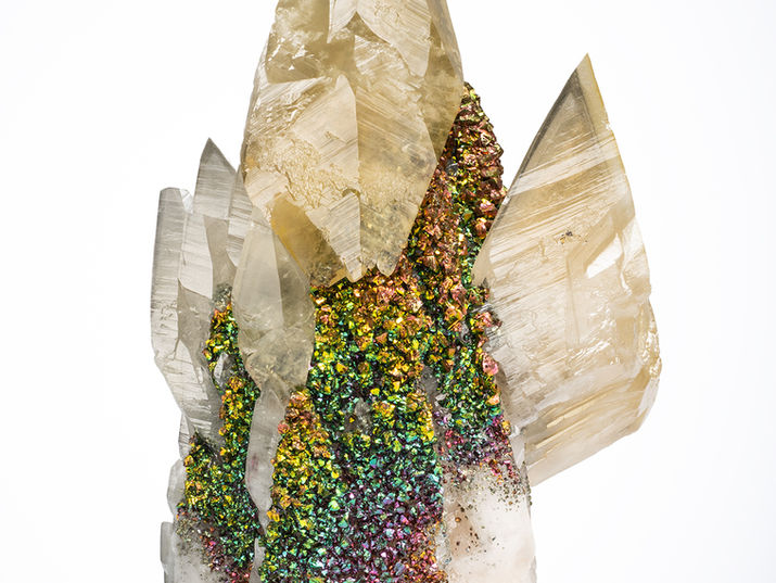 In summer of 2021 a shocking new find came from the Fletcher Mine, a massive aggregate quarry in Missouri, USA. Naturally iridescent chalchopyrite crystals covering and overgrown by several generations of sharply crystallized calcites.